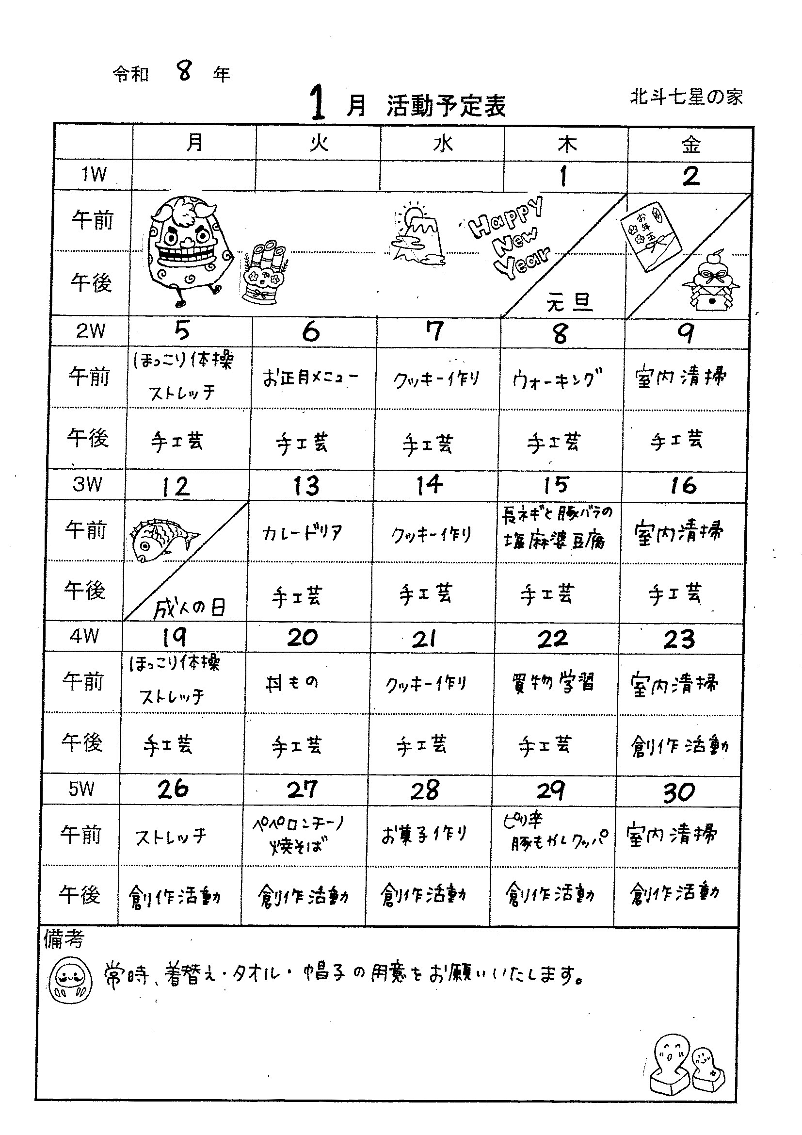 北斗七星の家からのお知らせです。予定は変更になることがあります。